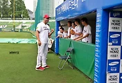 윤석민 재활군에서 피칭할 때 관람객이 된 심동섭. 운동 하러 가라는 트레이너의 구박에 조금만 더 보고 가겠다고 투정