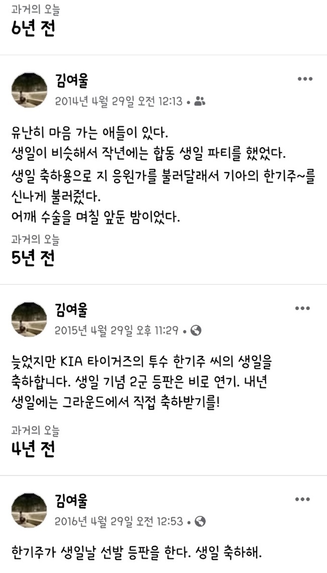 페이스북 과거의 오늘. 4월 29일은 한기주 생일을 기념하는 날이었구나.