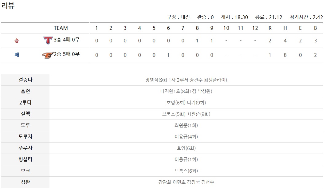 ◇대전전적 KIA 000 000 011 - 2
