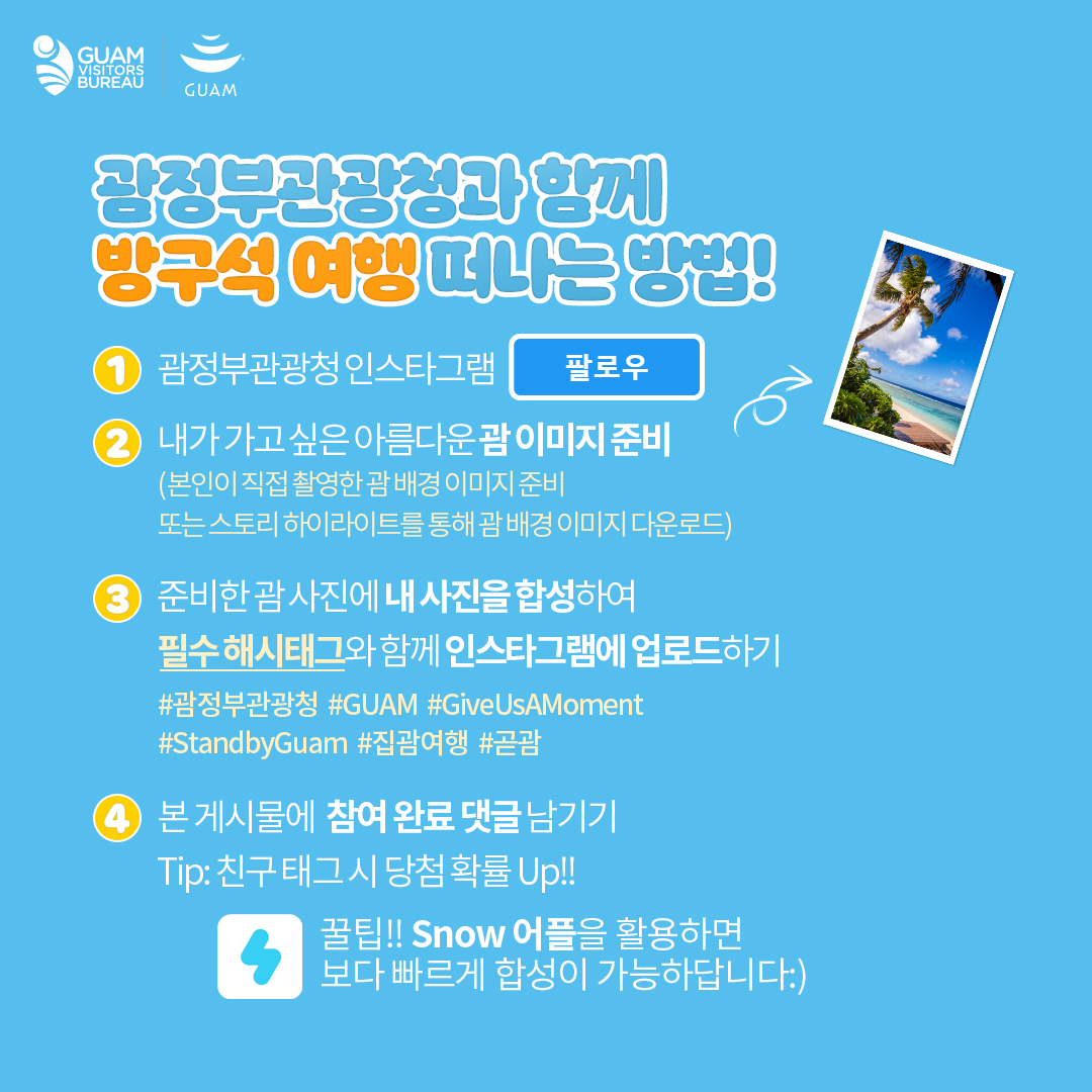 필수 해시태그(#GUAM #GiveUsAMoment #StandbyGuam #집괌여행 #곧괌)