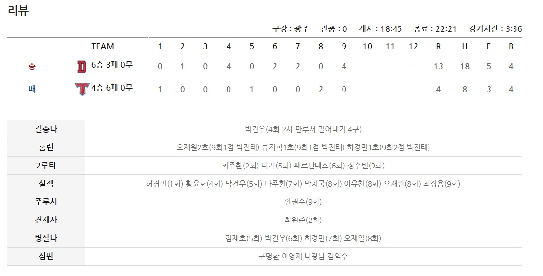 △승리투수 = 유희관(1승 1패) △패전투수 = 임기영(2패) △홈런 = 오재원 2호(9회1점) 류지혁 1호(9회1점) 허경민 1호(9회2점·이상 두산)