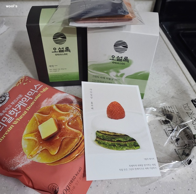 1월 구성품은 그린티라떼더블샷 10입, 세작 10입, 블렌디드 키트 3입, 벅 703 미니 원형툴, 백설 핫케익믹스 그리고 엽서 같은 레시피 설명서.