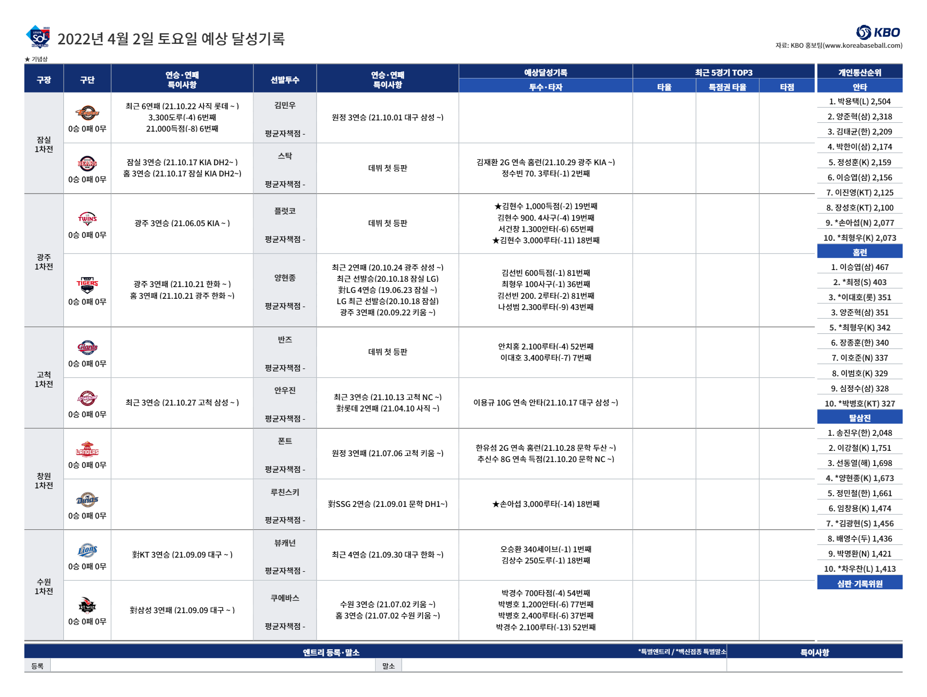 | 프로야구 2022년 4월 2일 전적 - LG·두산·SSG·롯데·KT … 양현종 4실점 비자책 패전 (0) | 2022.04.03 |