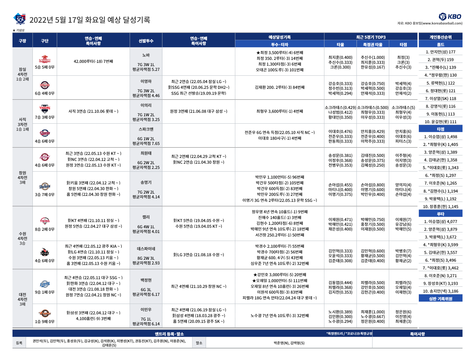 | 2022년 4월 2일(토) KBO 예상 달성 기록 (0) | 2022.04.02 |