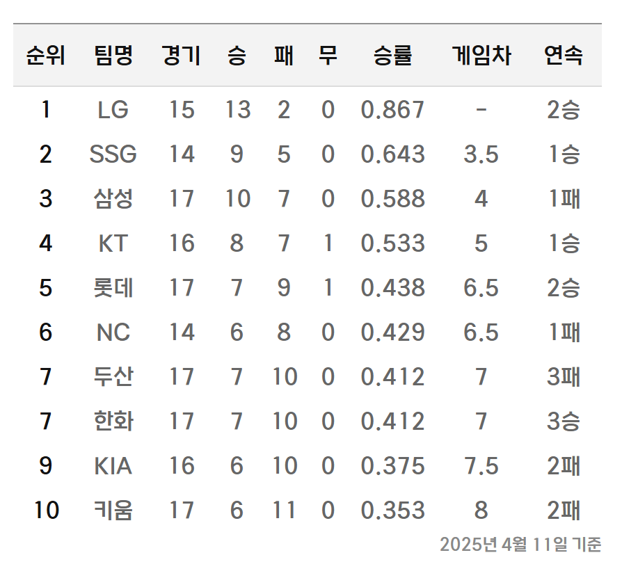 | [프로야구 4월 12일 전적] 롯데 강우 콜드승…‘우천취소’ KIA 최하위 추락 (0) | 2025.04.12 |